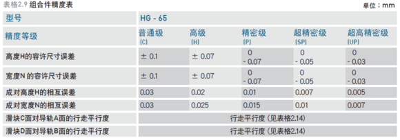 上銀的HG系列非互換性滾珠直線導(dǎo)軌的精度指標(biāo)如下,我們選用一個小規(guī)格HG-15,20和一個大規(guī)格HG-65的來做為對比基準(zhǔn):